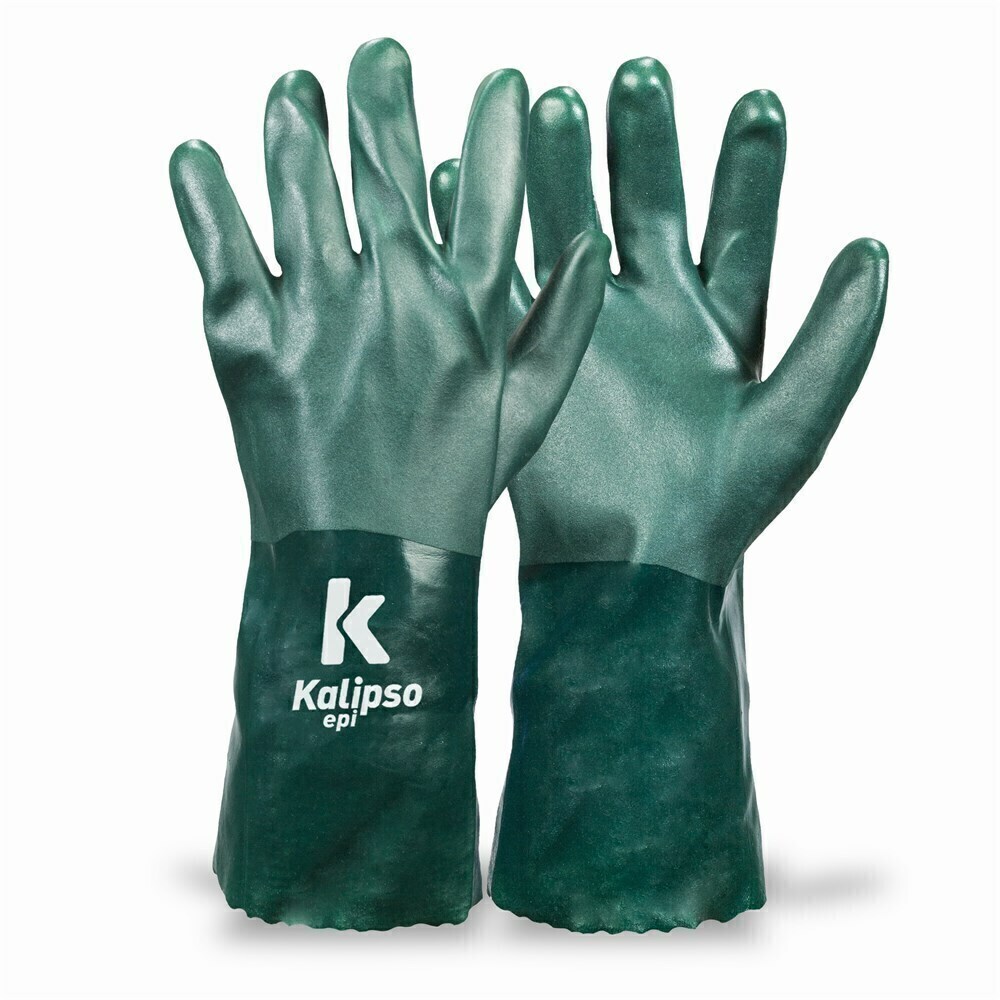 Luva de segurança, confeccionada em suporte têxtil de algodão, revestimento externo total em PVC (Policloreto de Vinila) com acabamento áspero antiderrapante na face palmar, extremidade dos dedos e dorso. Extremidade do punho com acabamento serrilhado.