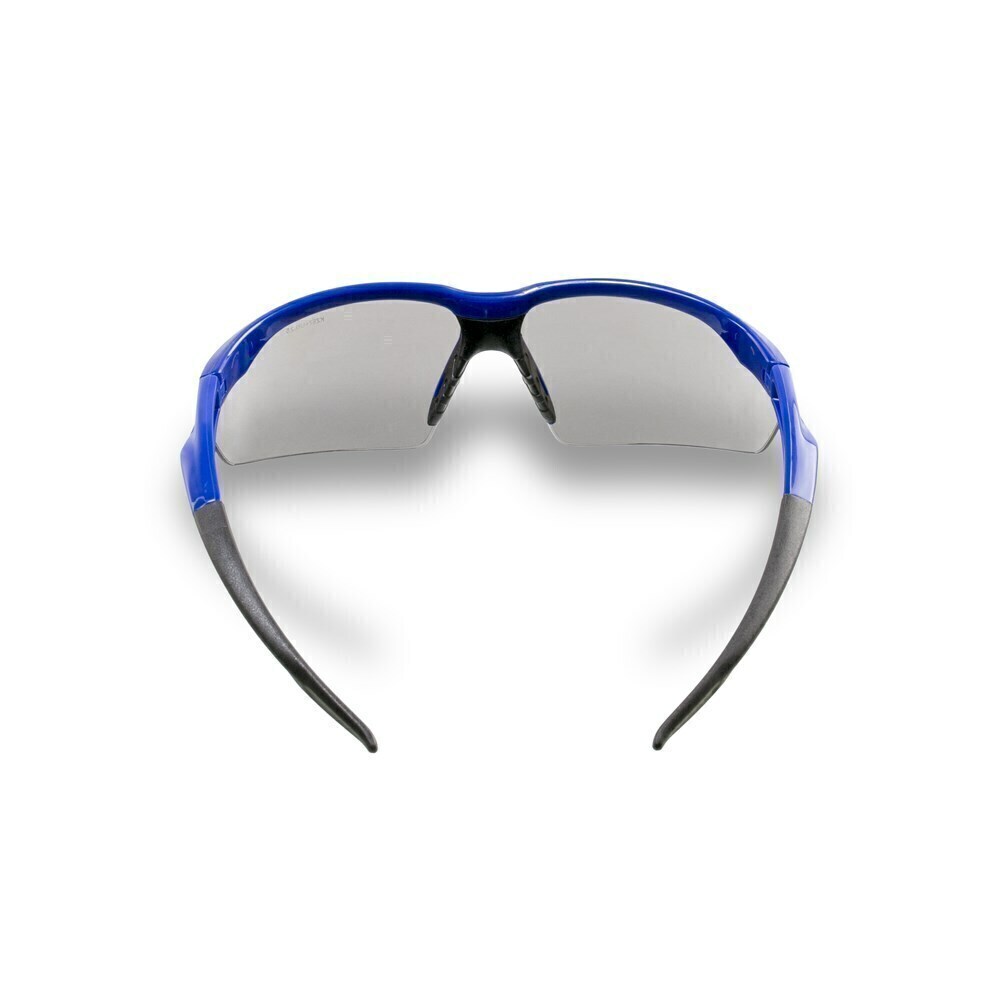 Óculos de segurança, constituídos de um arco de material plástico azul, dividido em duas partes pela ponte e apoio nasal com seis pinos localizados na posição do nariz, utilizados para encaixe do apoio nasal de plástico (silicone), caneletas e fendas na extremidade, utilizadas para o encaixe de um QUALIFLEXr confeccionado em policarbonato incolor, amarelo, verde, cinza, marrom, incolor com revestimento externo de filme prateado (Incolor Espelhado I/O) cinza com revestimento externo de filme prateado (cinza espelhado) ou cinza com revestimento externo de filme espelhado de azul, por meio de encaixe na parte externa do arco. As hastes são confeccionadas do mesmo material do arco e são fixadas ao arco através de parafusos metálicos e possuem meia haste de borracha.